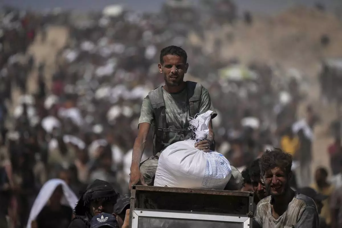Palestinians carry sacks of flour taken from a humanitarian aid convoy in the outskirts of Beit Lahiya, northern Gaza Strip, Aug. 1, 2025. (AP Photo/Jehad Alshrafi)