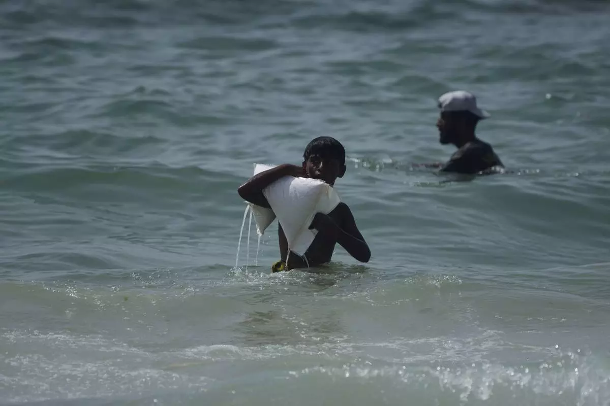 A Palestinian youth carries a sack of aid that landed in the Mediterranean Sea after being airdropped over central Gaza, at the shore of Zawaida, Gaza Strip, July 29, 2025. (AP Photo/Abdel Kareem Hana)