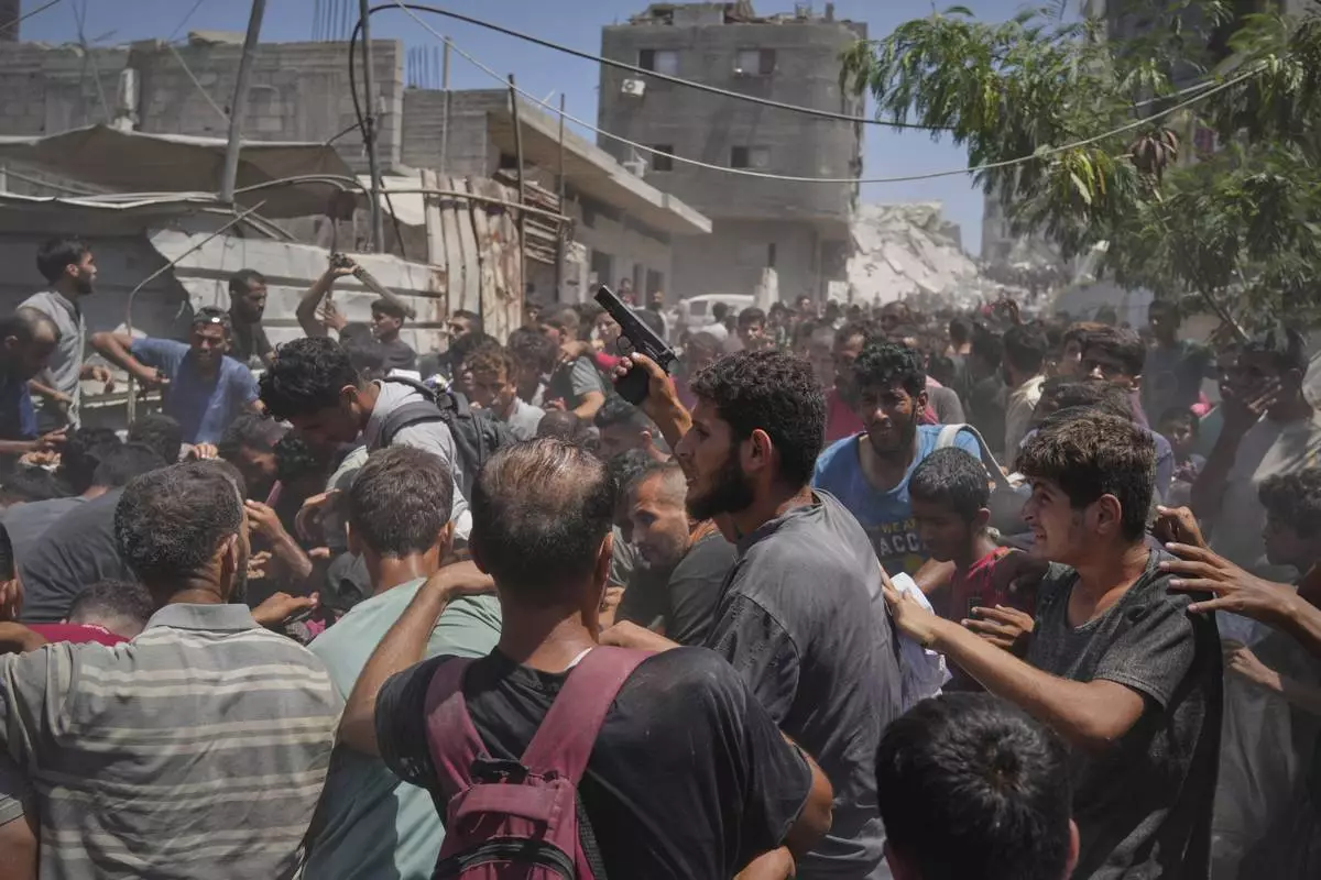 A Palestinian man waves a pistol as others struggle to collect humanitarian aid airdropped into Gaza City, northern Gaza Strip, Aug. 7, 2025. (AP Photo/Jehad Alshrafi)