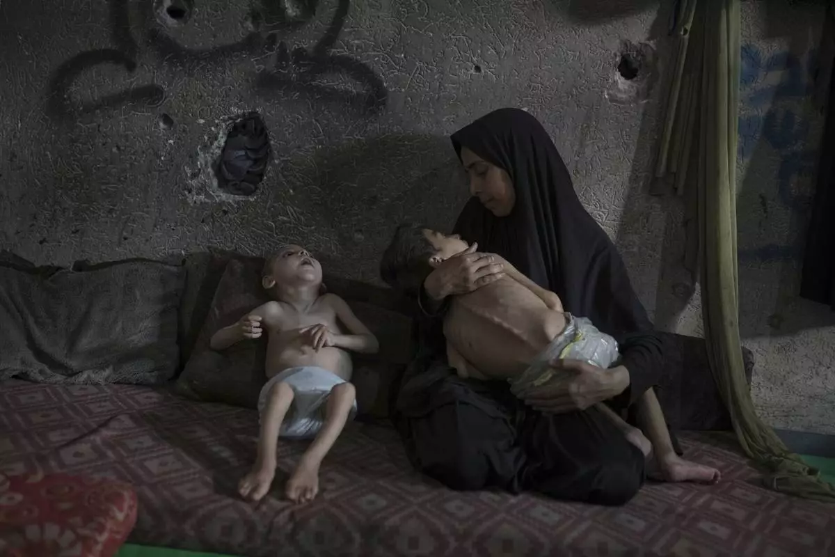 Samah Matar poses for a photo with her sons, Yousef, 6, in her arms, and Amir, 4, affected by malnutrition and cerebral palsy, at a U.N.-run school in Gaza City, July 26, 2025. (AP Photo/Jehad Alshrafi)