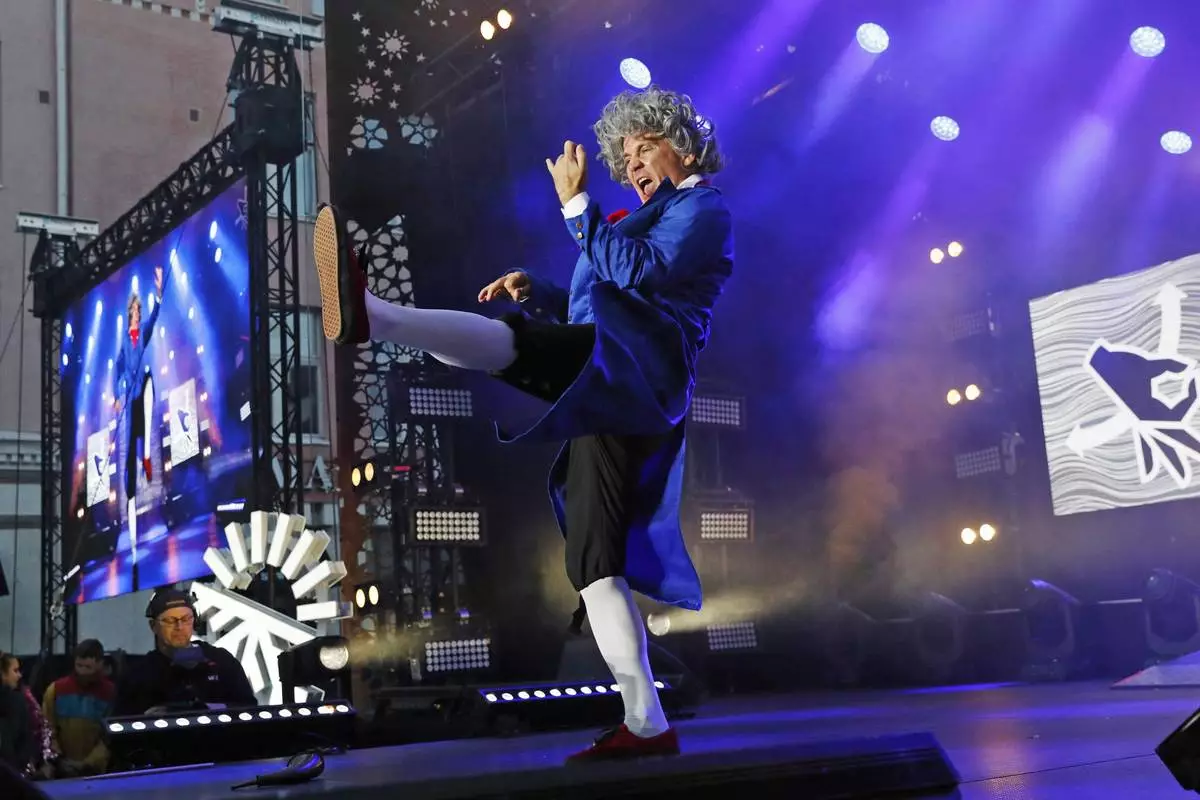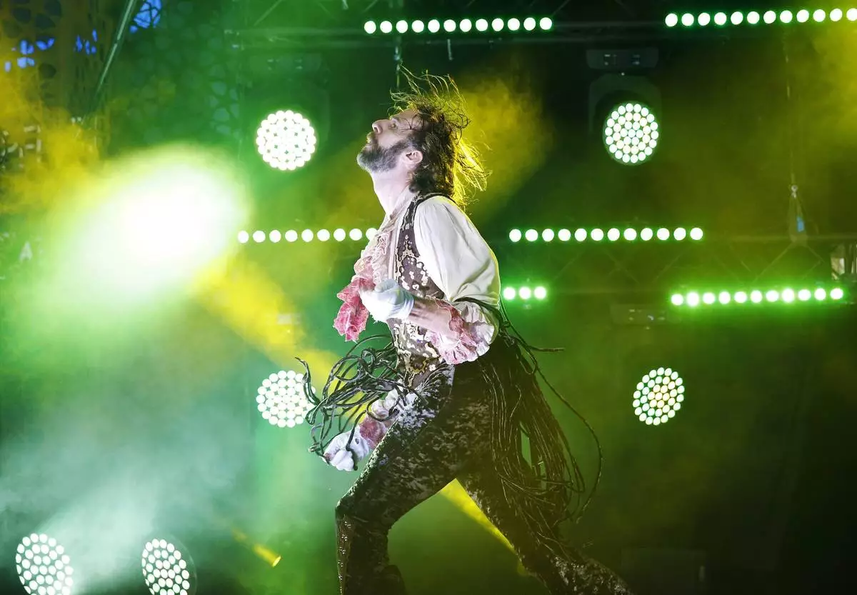 FILE - Winner Rob Messel 'The Marquis' of the U.S performs during the Air Guitar World Championships final in Oulu, Finland on Friday Aug. 23 2019. (Eeva Riihela/Lehtikuva via AP, file)