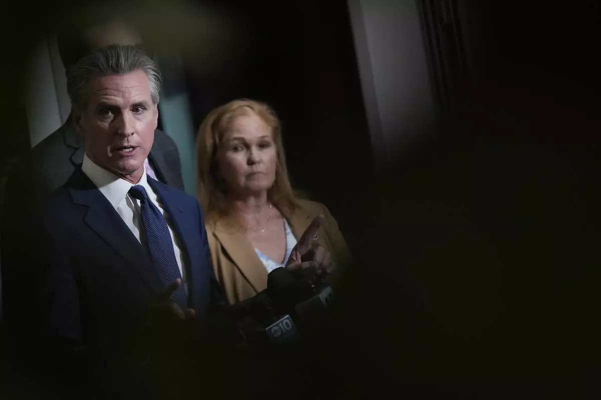California Gov. Gavin Newsom answers questions after signing legislation calling for a special election on a redrawn congressional map on Thursday, Aug. 21, 2025, in Sacramento, Calif. (AP Photo/Godofredo A. Vásquez)