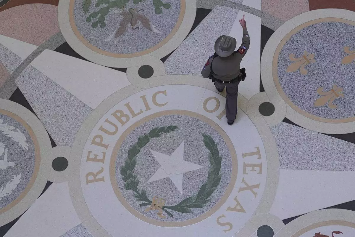 A Texas troopers passes the Texas Seal in the Rotunda of the Texas Capitol before debate on a bill on a redrawn U.S. congressional map during a special session in the Senate Chamber in Austin, Texas, Friday, Aug. 22, 2025. (AP Photo/Eric Gay)