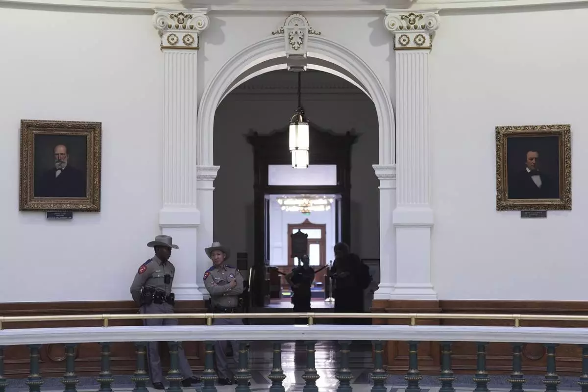 Texas troopers stand watch in the Rotunda of the Texas Capitol before debate on a bill on a redrawn U.S. congressional map during a special session in the Senate Chamber in Austin, Texas, Friday, Aug. 22, 2025. (AP Photo/Eric Gay)