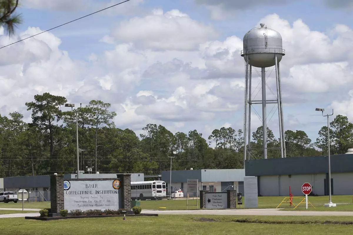 A sign marks the entrance to the Baker Correctional Institution, Sanderson, Fla., Thursday, Aug. 14, 2025. (AP Photo/Gary McCullough)
