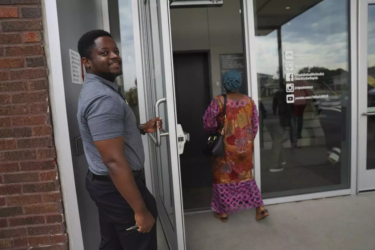 Mugisha Gloire, a Congolese refugee who came as a child to Iowa, holds the door open for driver's ed participants at St. Paul's United Methodist Church on Saturday, Aug. 9, 2025, in Cedar Rapids, Iowa. (AP Photo/Jessie Wardarski)