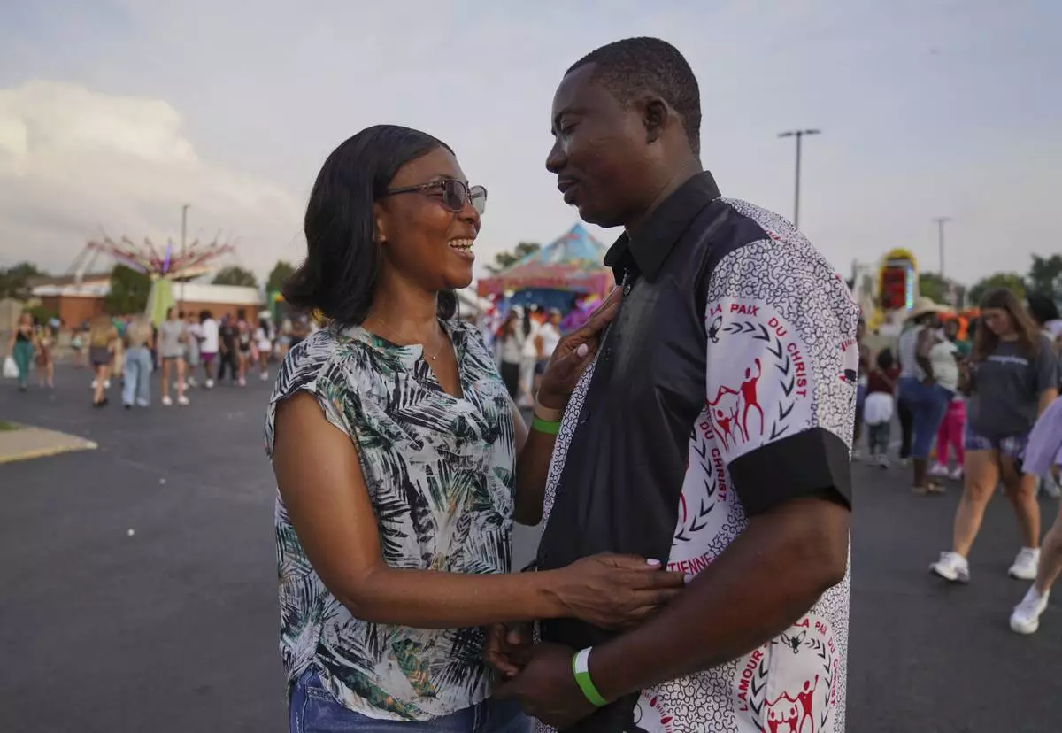 Clarisse Mutombo, left, poses for a portrait with her husband and St. Jude Catholic Church parish council member, Martin Mutombo, both immigrants from Congo, at the St. Jude Catholic Church's Sweet Corn Festival on Saturday, Aug. 9, 2025, in Cedar Rapids, Iowa. (AP Photo/Jessie Wardarski)