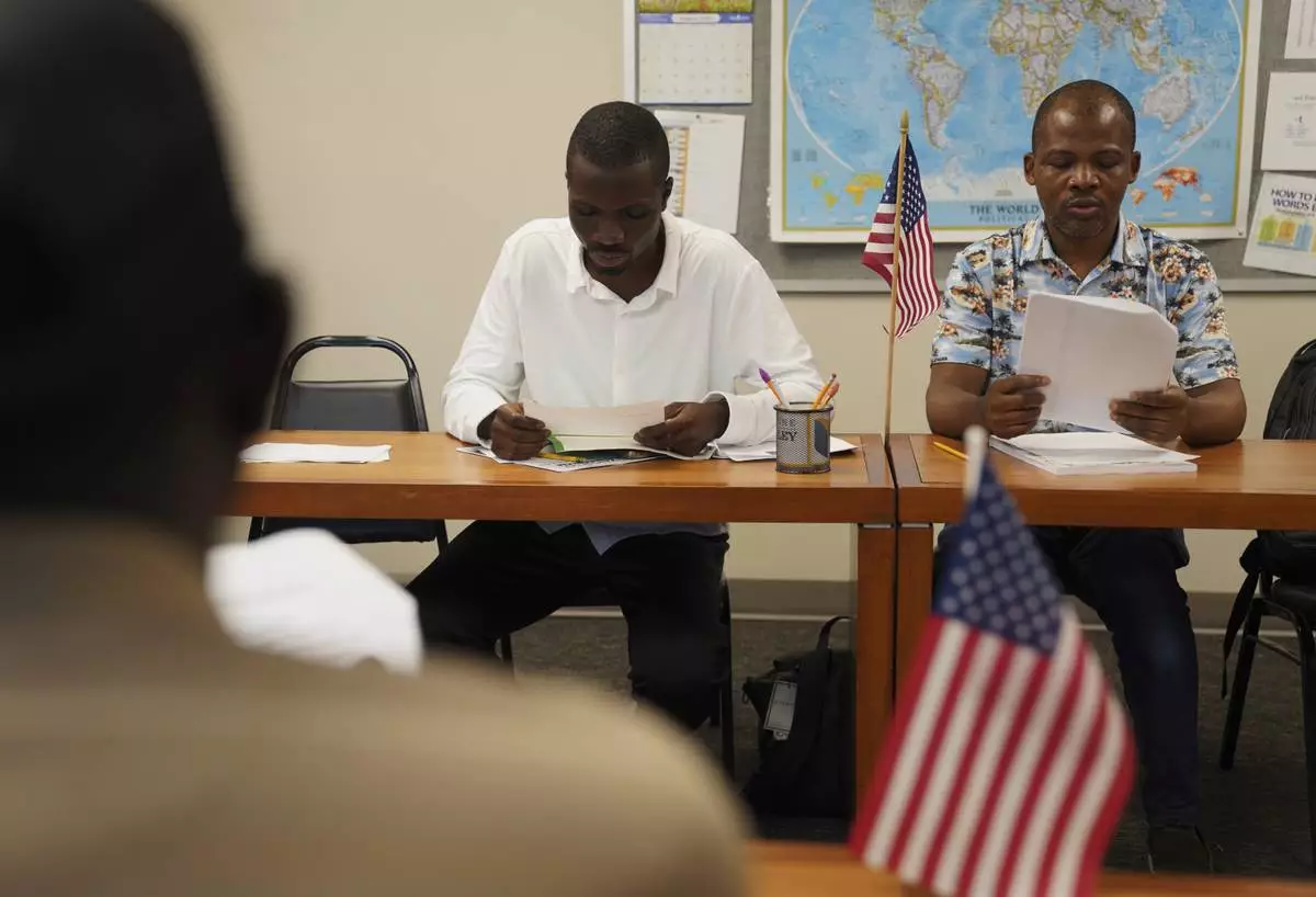 Five men from China, Benin, Congo, Togo and Sudan, and a Guatemalan woman and her son, take a citizenship class at The Catherine McAuley Center, founded by the Catholic Sisters of Mercy order, on Saturday, Aug. 9, 2025, in Cedar Rapids, Iowa. (AP Photo/Jessie Wardarski)