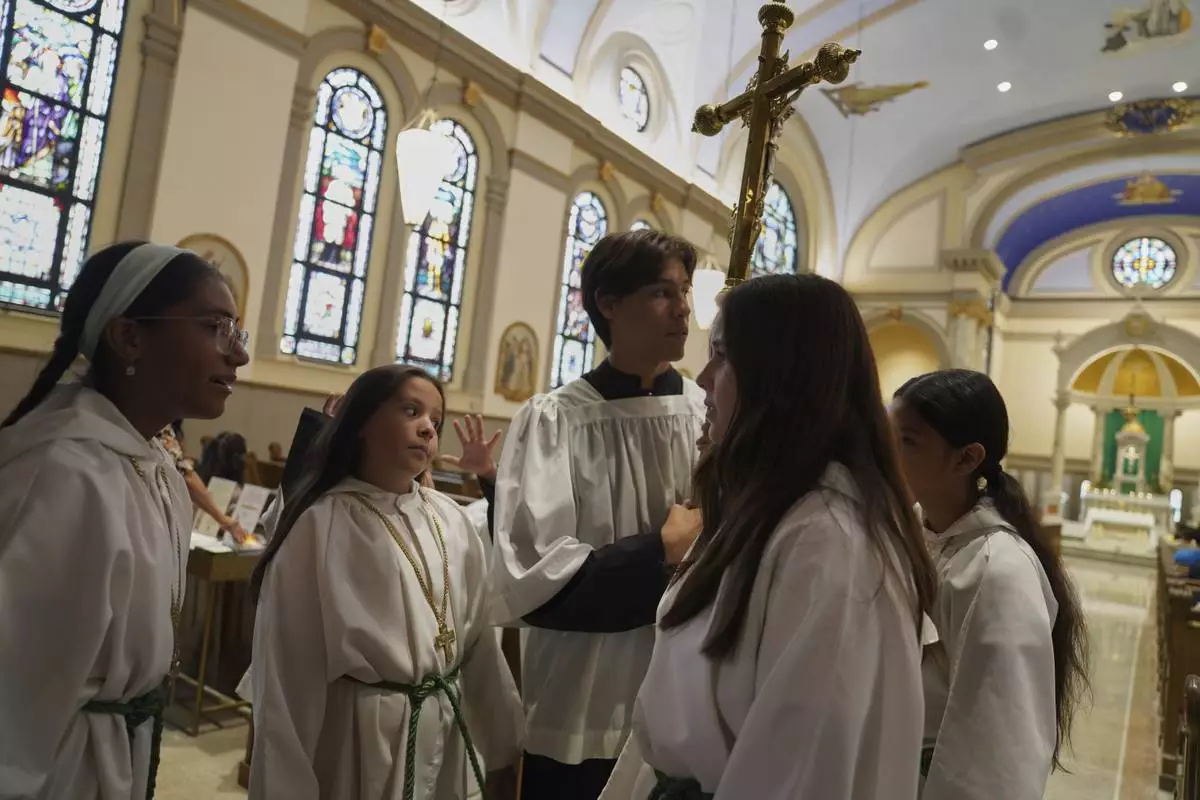 Altar boys and girls talk before service at Immaculate Conception Catholic Church on Sunday, Aug. 10, 2025, in Cedar Rapids, Iowa. (AP Photo/Jessie Wardarski)