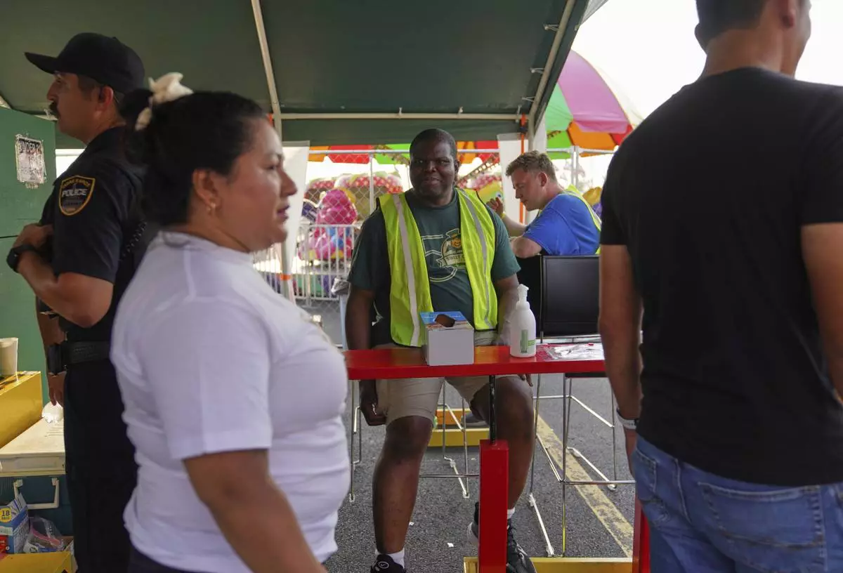 Roger Atchou, center, a father of two from Togo volunteers at the St. Jude Catholic Church's Sweet Corn Festival on Saturday, Aug. 9, 2025, in Cedar Rapids, Iowa. (AP Photo/Jessie Wardarski)