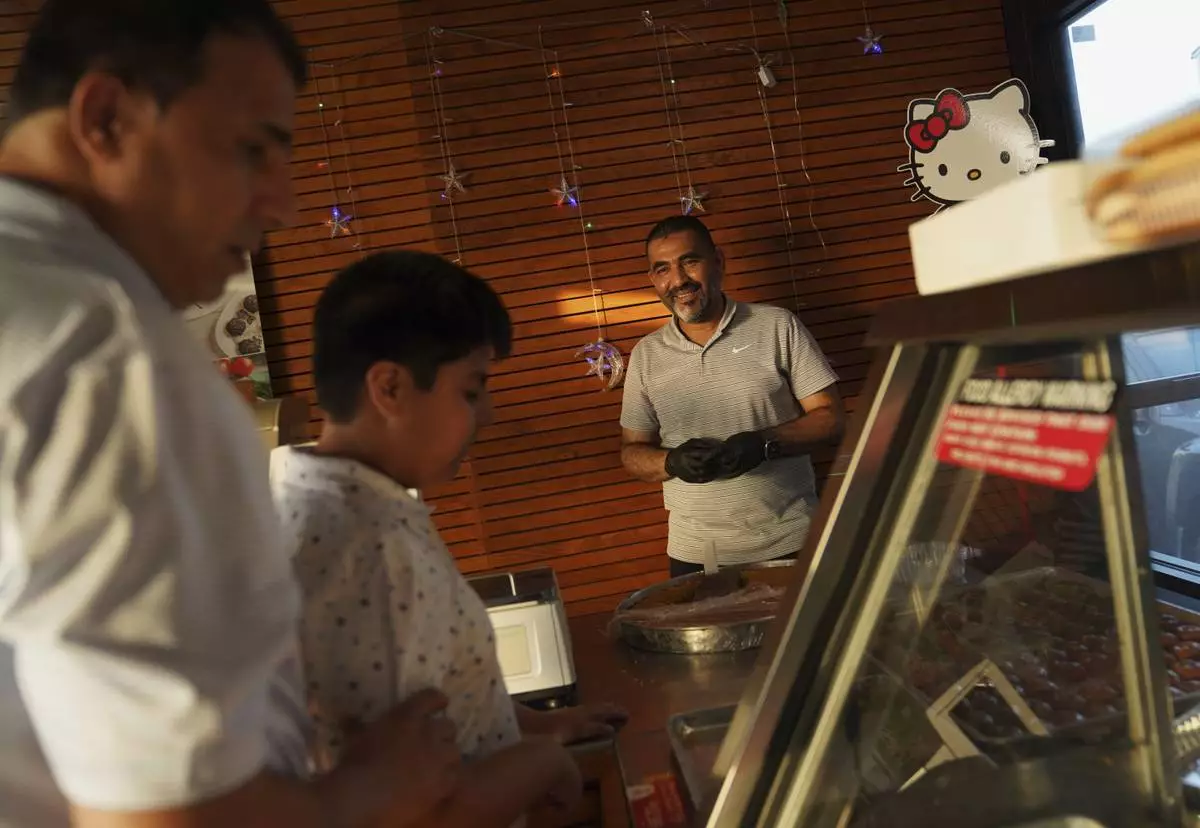 Mohamed Mahmoud, right, helps Afghan refugee Faroz Waziri, left, and his son select deserts at the halal grocery store he opened in 2022 after immigrating from Sudan on Friday, Aug. 8, 2025, in Cedar Rapids, Iowa. (AP Photo/Jessie Wardarski)