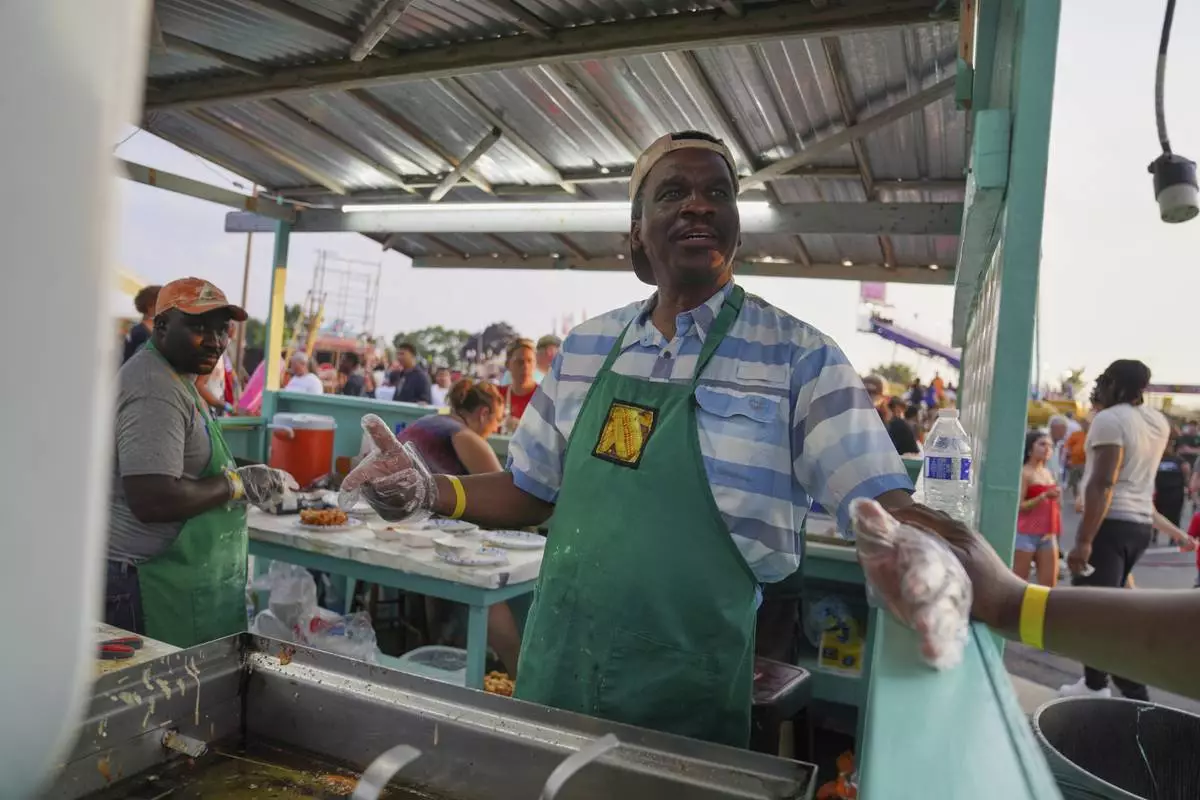 Bienvenue D'Almeida, who applied for and won the so-called green card lottery, a program for countries with low rates of emigration to the United States, makes funnel cake and deep-fried Snickers bars at the St. Jude Catholic Church's Sweet Corn Festival on Saturday, Aug. 9, 2025, in Cedar Rapids, Iowa. (AP Photo/Jessie Wardarski)