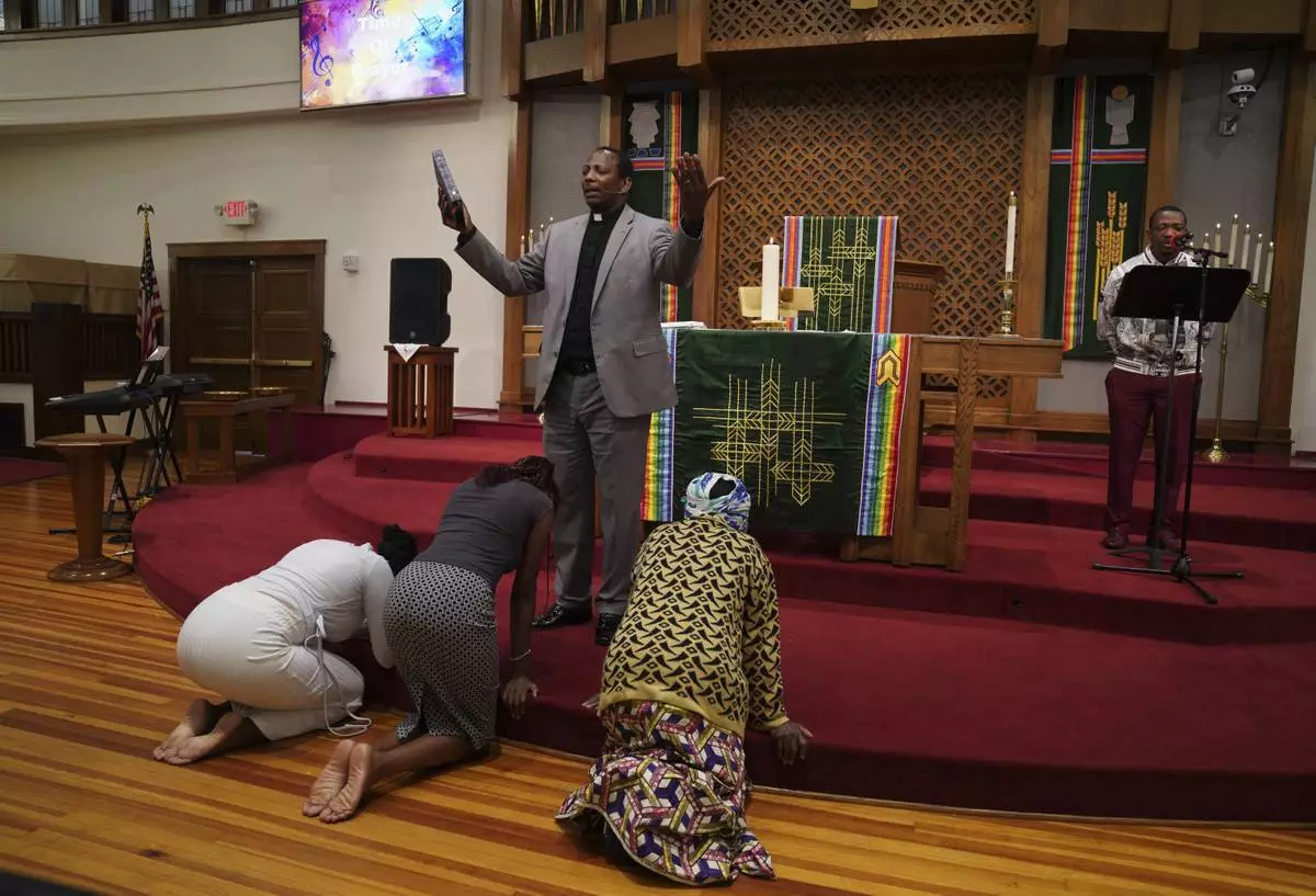 The Rev. Daniel Niyonzima, a refugee from Burundi who arrived in the United States with his wife 20 years ago, prays with congregants in Kirundi, one of Burundi's languages, during service at St. Paul's United Methodist Church on Sunday, Aug. 10, 2025, in Cedar Rapids, Iowa. (AP Photo/Jessie Wardarski)