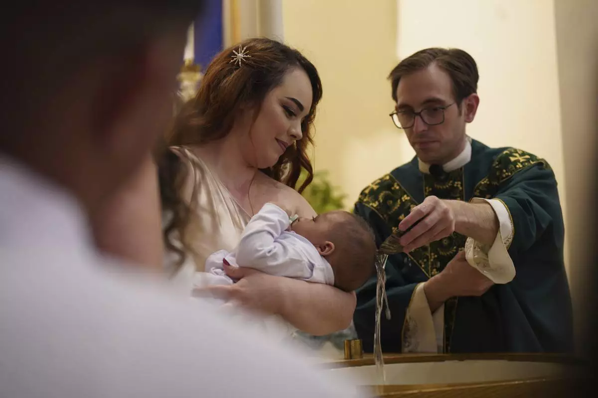 Gabriela Plasencia, originally from the Mexican state of Jalisco, holds her 4-month-old nephew Gael as he's baptized at Immaculate Conception Catholic Church on Sunday, Aug. 10, 2025, in Cedar Rapids, Iowa. (AP Photo/Jessie Wardarski)