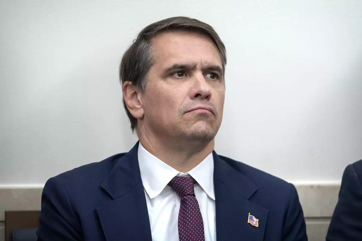 Deputy Attorney General Todd Blanche listens as President Donald Trump speaks with reporters in the James Brady Press Briefing Room at the White House, Monday, Aug. 11, 2025, in Washington. (AP Photo/Mark Schiefelbein)