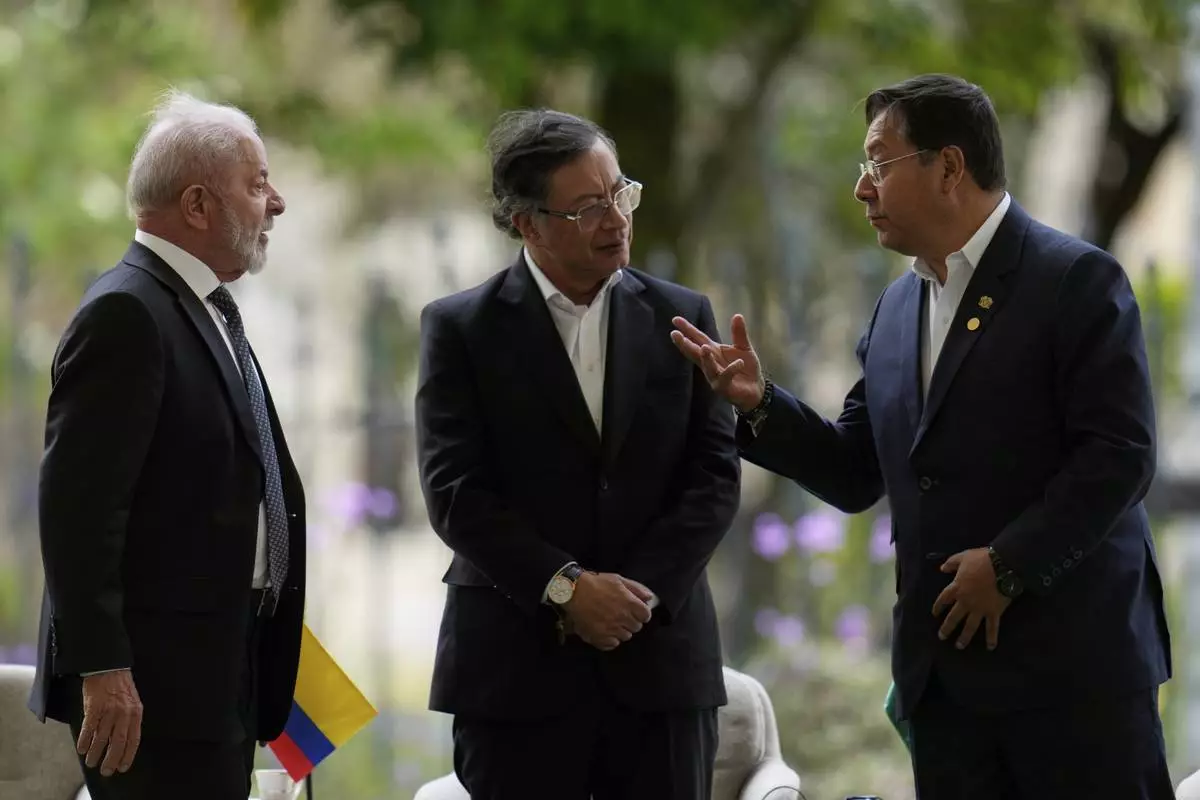 Bolivia's President Luis Arce, right, talks to Brazil's President Luiz Inacio Lula da Silva, left, and Colombia's President Gustavo Petro during a meeting of leaders of the Amazon Cooperation Treaty Organization in Bogota, Colombia, Friday, Aug. 22, 2025. (AP Photo/Fernando Vergara)