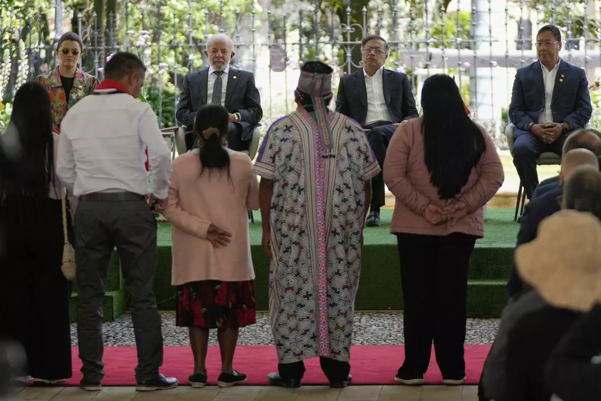From left back, Ecuador's Vice President Maria Jose Ping, Brazil's President Luiz Inacio Lula da Silva, Colombia's President Gustavo Petro, and Bolivia's President Luis Arce meet with Indigenous leaders during a summit of leaders of the Amazon Cooperation Treaty Organization in Bogota, Colombia, Friday, Aug. 22, 2025. (AP Photo/Fernando Vergara)