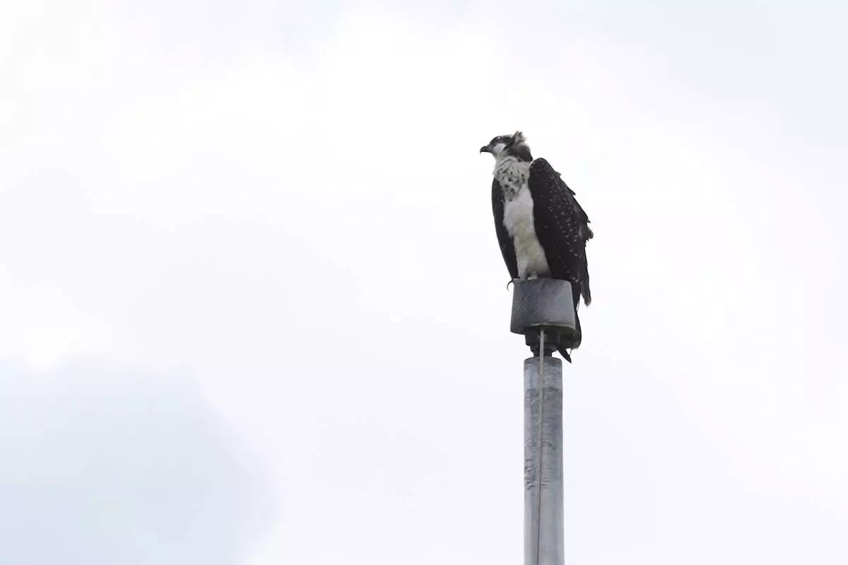 An osprey perches on a flagpole near its nest at a high school athletic field Wednesday, Aug. 20, 2025, in Apple Valley, Minn. (AP Photo/Mark Vancleave)