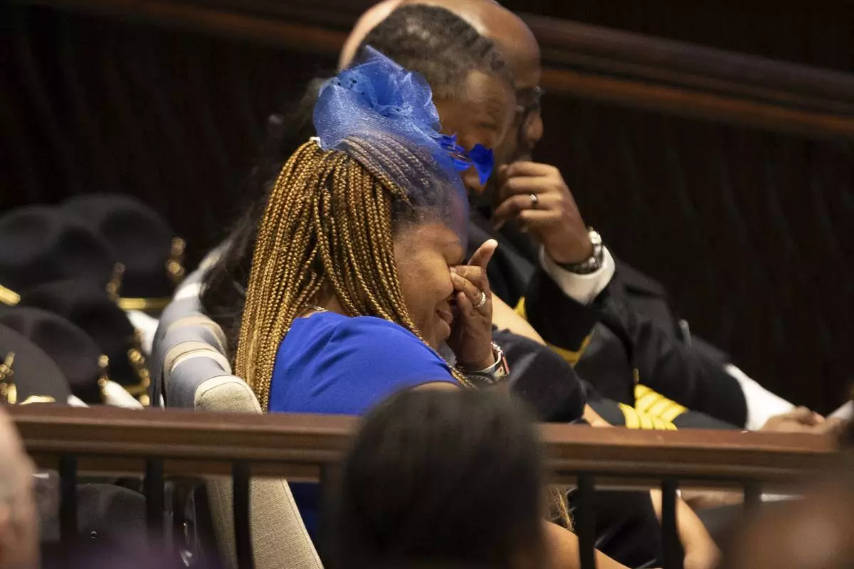 The mother of DeKalb County Police Officer David Rose is emotional during his funeral service at First Baptist Church Atlanta in Atlanta, Friday, Aug. 22, 2025. Rose was killed while responding to a shooting at the CDC. (Arvin Temkar/Atlanta Journal-Constitution via AP)