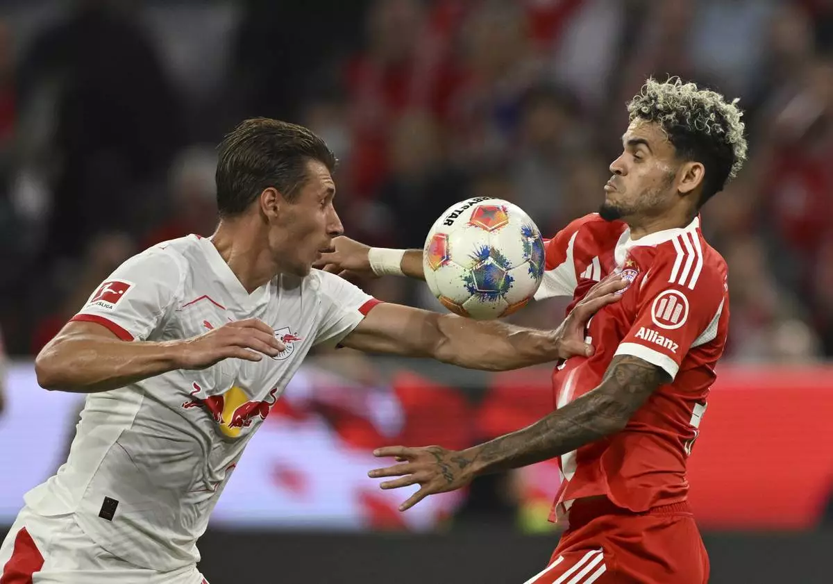 Bayern Munich's Luis Díaz, right, and RB Leipzig's Willi Orbán in action during the Bundesliga soccer match between Bayern Munich and RB Leipzig at Allianz Arena, Munich, Germany, Friday Aug. 22, 2025. (Sven Hoppe/dpa via AP)