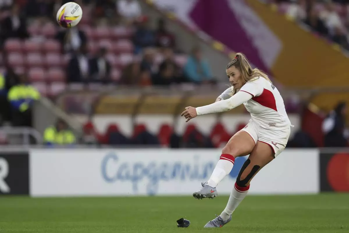 Zoe Harrison of England converts a try during the group A match at the 2025 Women's Rugby World Cup between England and the United States in Sunderland, England, Friday, Aug. 22, 2025. (AP Photo/Scott Heppell)