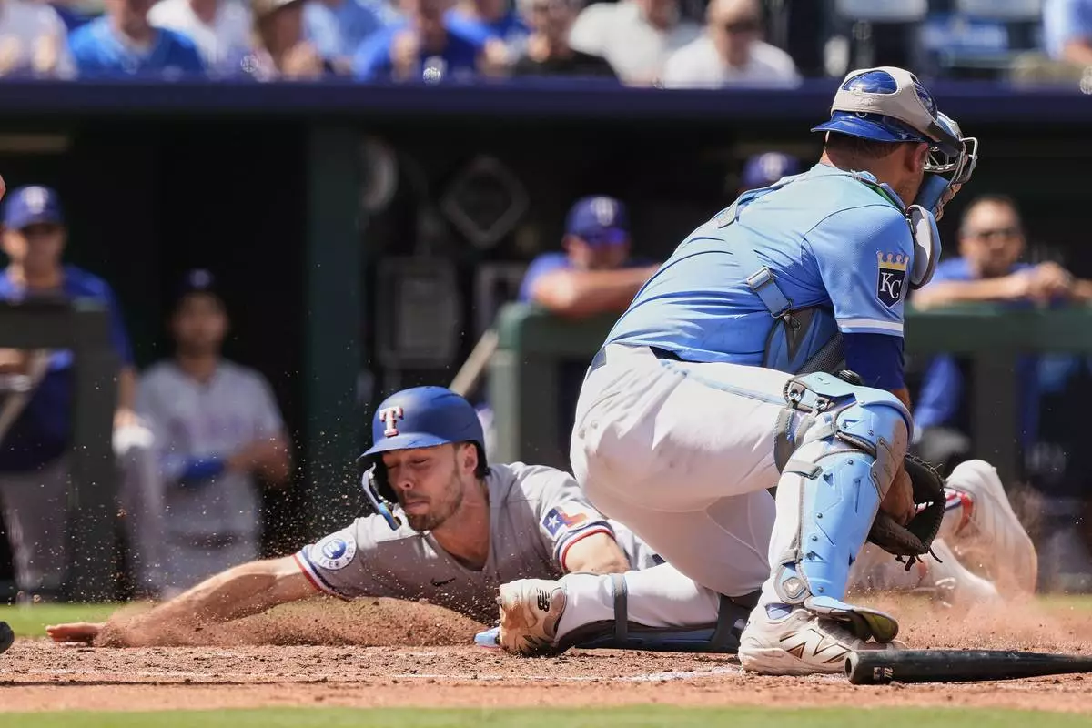 Texas Rangers' Evan Carter beats the tag by Kansas City Royals catcher Luke Maile to score on a two-run single hit by Josh Smith during the fifth inning of a baseball game Thursday, Aug. 21, 2025, in Kansas City, Mo. (AP Photo/Charlie Riedel)