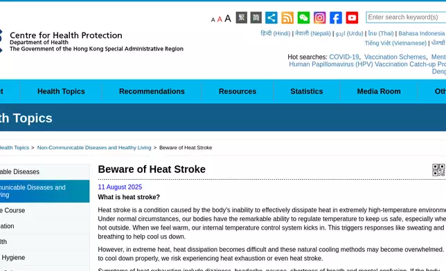 "Heat stroke is one of the most common health risks in hot weather. Over the past five years, there have been over 200 hospital admissions due to heat stroke each year in Hong Kong, with two to five fatal cases occurring mainly during the summer months from May to September. Vulnerable groups are more susceptible to heat stroke. Symptoms include dizziness, headache, nausea, shortness of breath or confusion. In severe cases, patients may suffer from convulsions or become unconscious, which can be life-threatening if they are not cooled down and resuscitated in a timely manner," a spokesman for the CHP said.