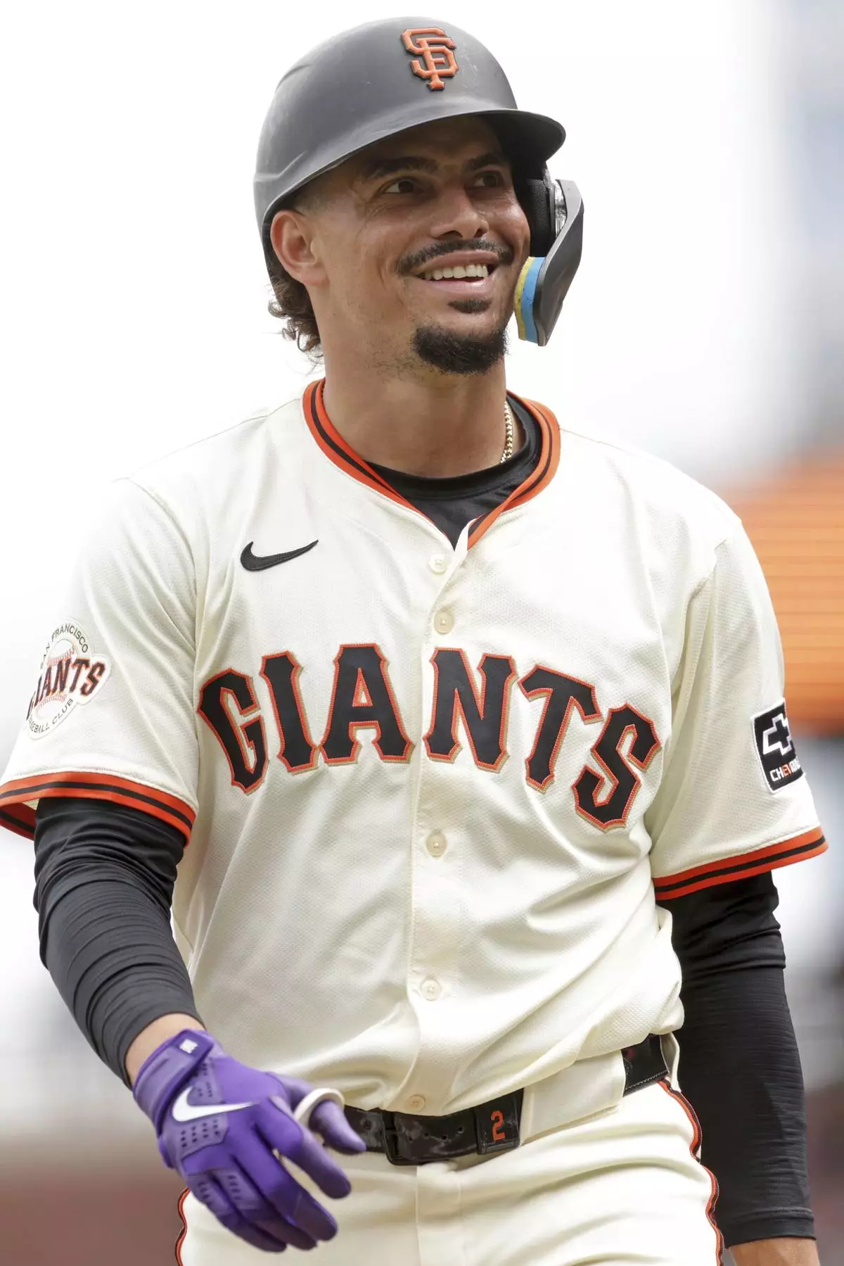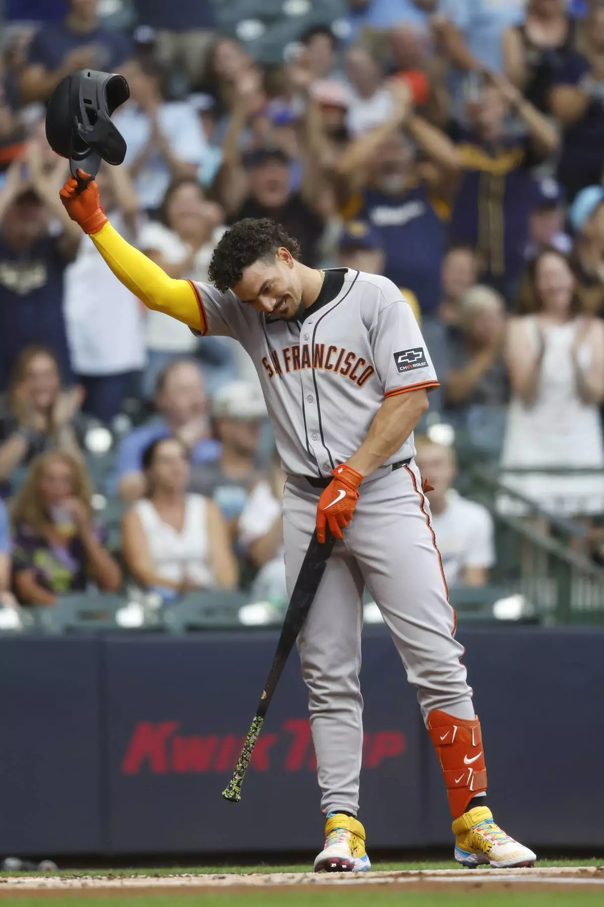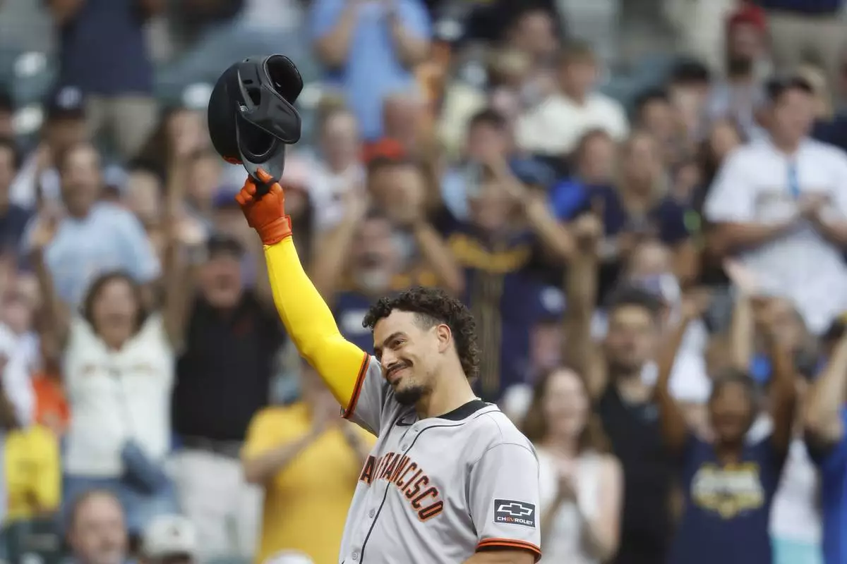 San Francisco Giants shortstop Willy Adames reacts to applause during his first at-bat during the first inning of a baseball game against the Milwaukee Brewers, Friday, Aug. 22, 2025, in Milwaukee. (AP Photo/Jeffrey Phelps)