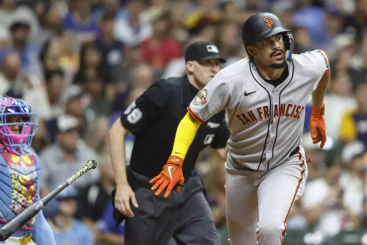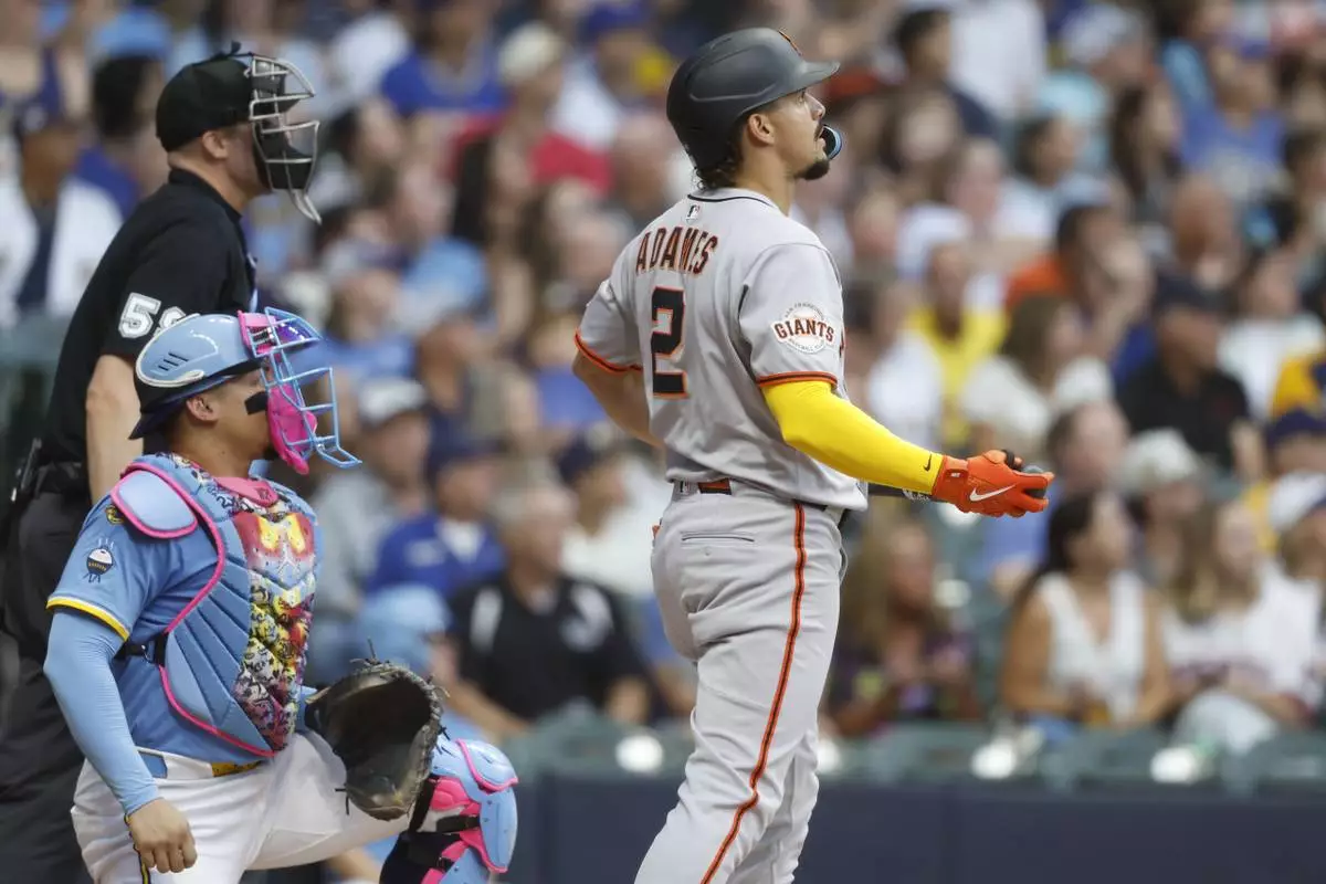 San Francisco Giants' Willy Adames watches his home run during the first inning of a baseball game against the Milwaukee Brewers, Friday, Aug. 22, 2025, in Milwaukee. (AP Photo/Jeffrey Phelps)