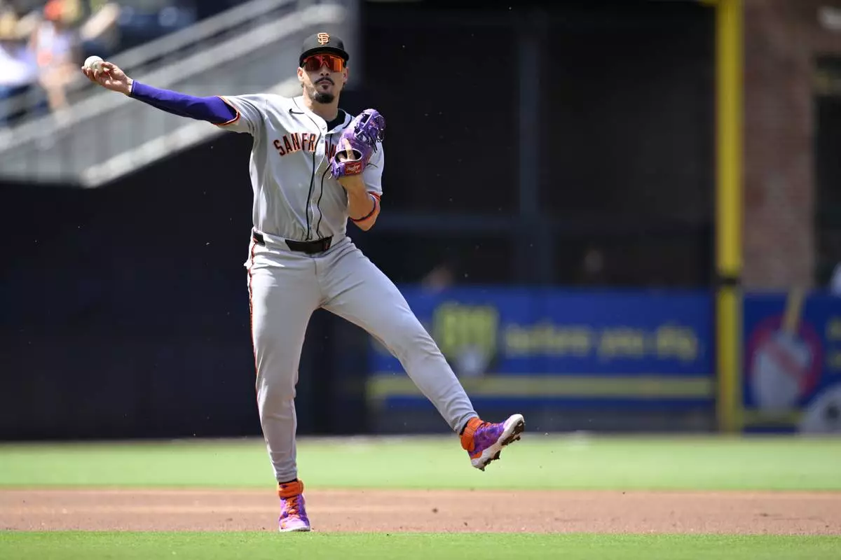 San Francisco Giants shortstop Willy Adames throws to first base on a groundout hit by San Diego Padres' Xander Bogaerts during the second inning of a baseball game Thursday, Aug. 21, 2025, in San Diego. (AP Photo/Orlando Ramirez)