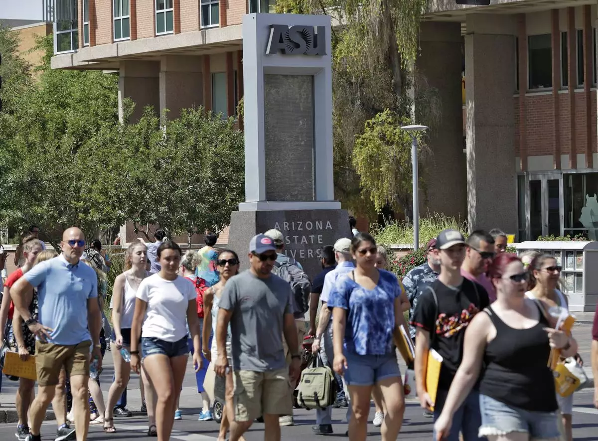 FILE - Pedestrians cross University Ave on the campus of Arizona State University in Tempe, Ariz., July 25, 2018. (AP Photo/Matt York, File)