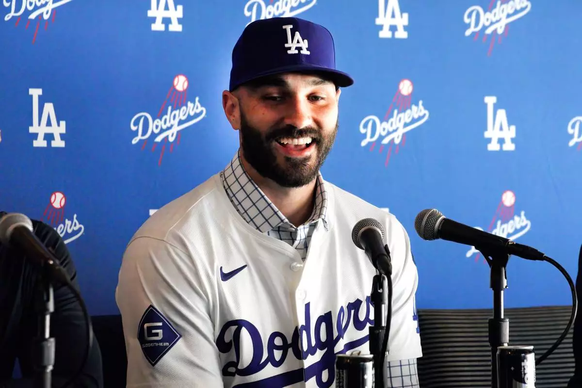 FILE - New Los Angeles Dodger reliever Tanner Scott answers questions during an introduction news conference at Dodger Stadium in Los Angeles on Thursday, Jan. 23, 2025. (AP Photo/Richard Vogel, File)