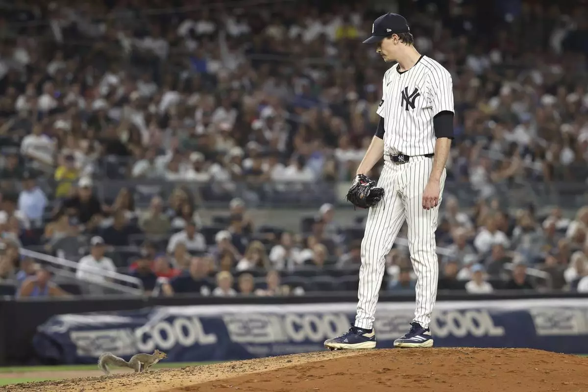 New York Yankees pitcher Max Fried watches a squirrel on the field during the fourth inning of a baseball game against the Boston Red Sox, Friday, Aug. 22, 2025, in New York. (AP Photo/Pamela Smith)