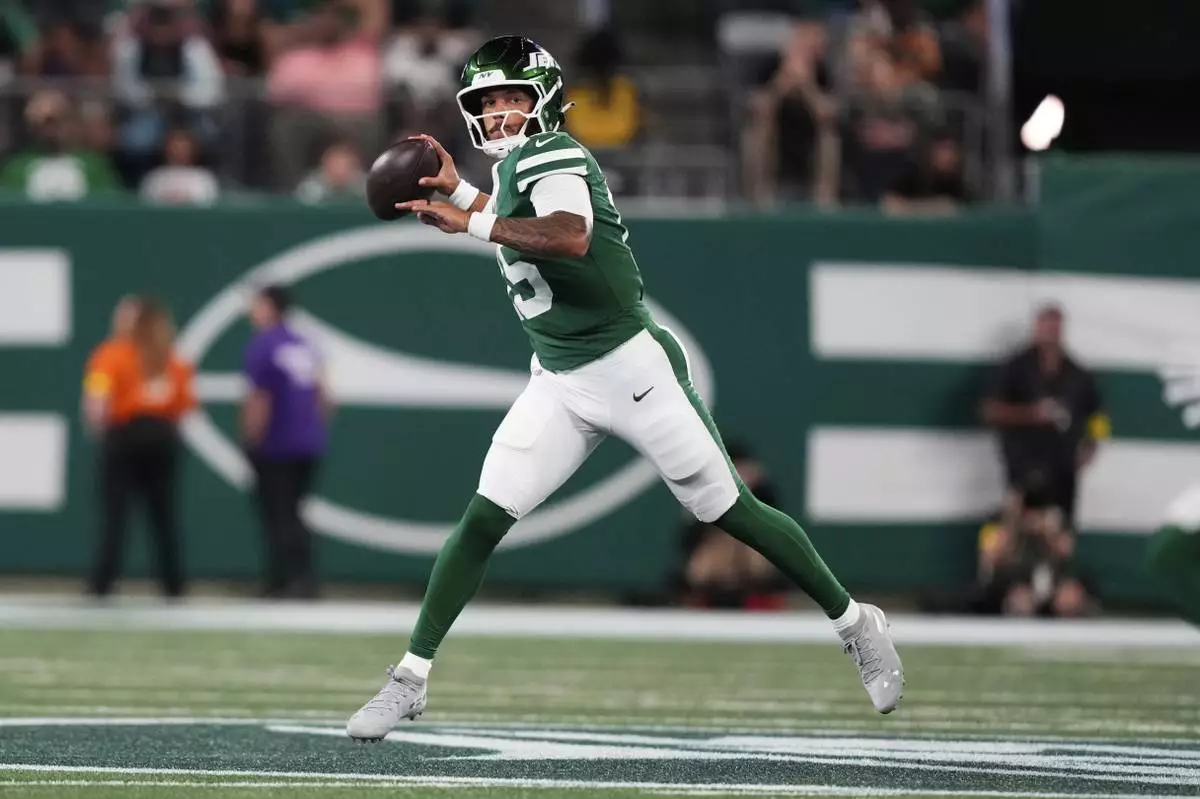 New York Jets quarterback Adrian Martinez (15) passes in the second half of a preseason NFL football game against the Philadelphia Eagles in East Rutherford, N.J., Friday, Aug. 22, 2025. (AP Photo/Yuki Iwamura)