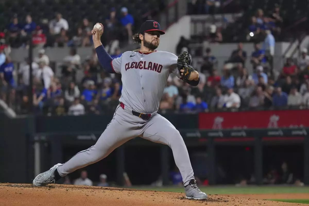 Cleveland Guardians starting pitcher Slade Cecconi throws during the first inning of a baseball game against the Texas Rangers, Friday, Aug. 22, 2025, in Arlington, Texas. (AP Photo/LM Otero)