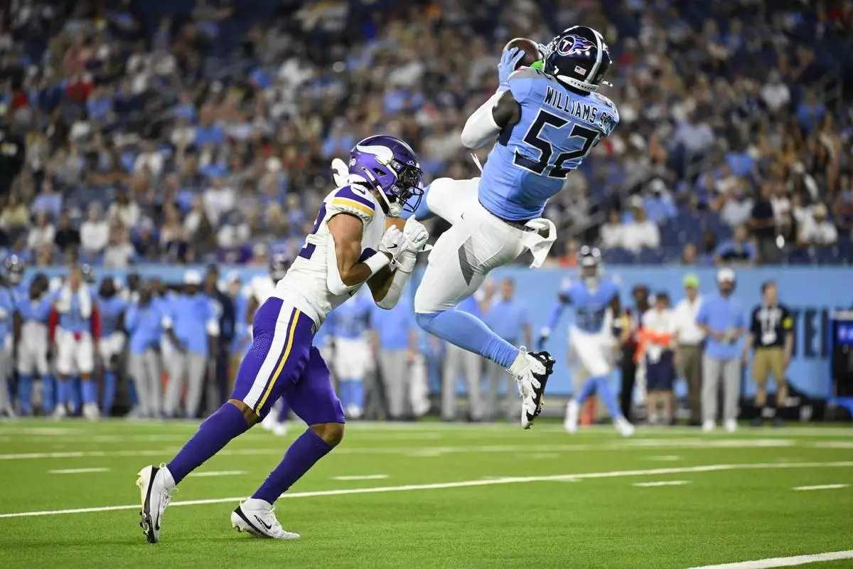 Tennessee Titans linebacker James Williams Sr. (52) intercepts a pass over Minnesota Vikings wide receiver Jeshaun Jones (82) during the first half of a preseason NFL football game, Friday, Aug. 22, 2025, in Nashville, Tenn. (AP Photo/John Amis)