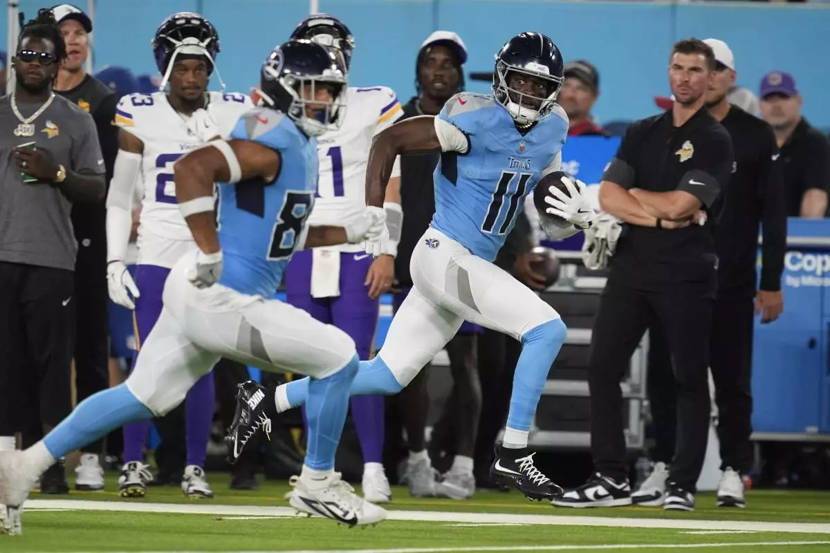Tennessee Titans wide receiver Van Jefferson (11) runs for a touchdown after a catch against the Minnesota Vikings during the first half of a preseason NFL football game, Friday, Aug. 22, 2025, in Nashville, Tenn. (AP Photo/George Walker IV)