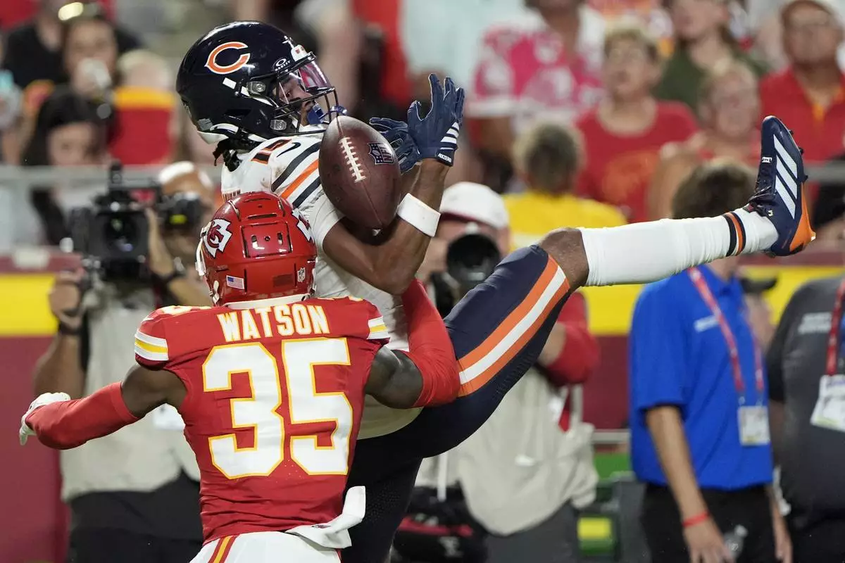 Chicago Bears wide receiver Rome Odunze is unable to catch a pass as Kansas City Chiefs cornerback Jaylen Watson (35) defends during the first half of a preseason NFL football game Friday, Aug. 22, 2025, in Kansas City, Mo. (AP Photo/Charlie Riedel)
