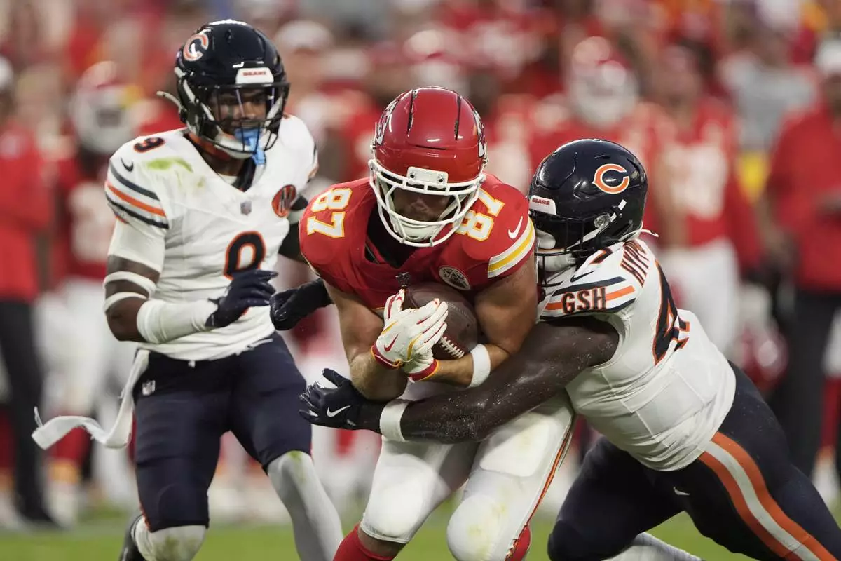 Kansas City Chiefs tight end Travis Kelce (87) is stopped by Chicago Bears linebacker Ruben Hyppolite II, right, as defensive back Jaquan Brisker (9) watches during the first half of a preseason NFL football game Friday, Aug. 22, 2025, in Kansas City, Mo. (AP Photo/Charlie Riedel)