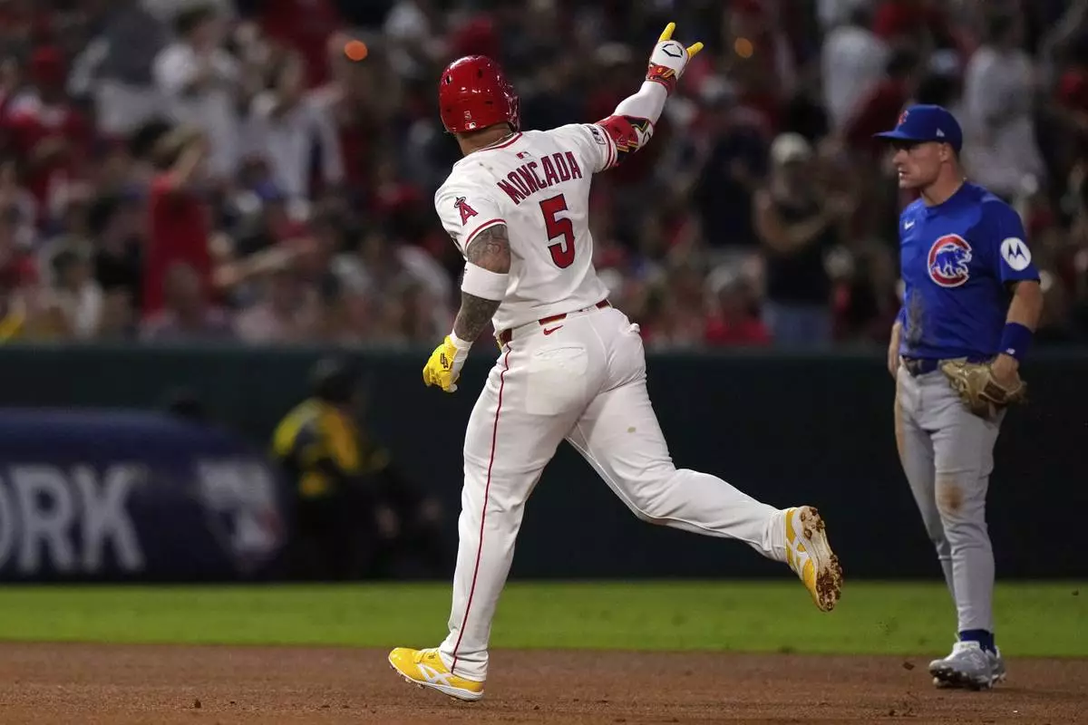 Los Angeles Angels' Yoan Moncada, left, gestures after hitting a solo home run as Chicago Cubs third baseman Matt Shaw stands by during the fifth inning of a baseball game Friday, Aug. 22, 2025, in Anaheim, Calif. (AP Photo/Mark J. Terrill)