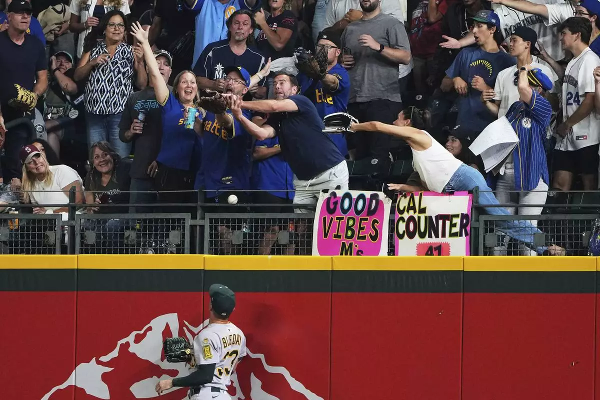 Fans cheer as the solo home run ball from Seattle Mariners' Jorge Polanco flies over the fence past Athletics right fielder JJ Bleday during the seventh inning of a baseball game Friday, Aug. 22, 2025, in Seattle. (AP Photo/Lindsey Wasson)