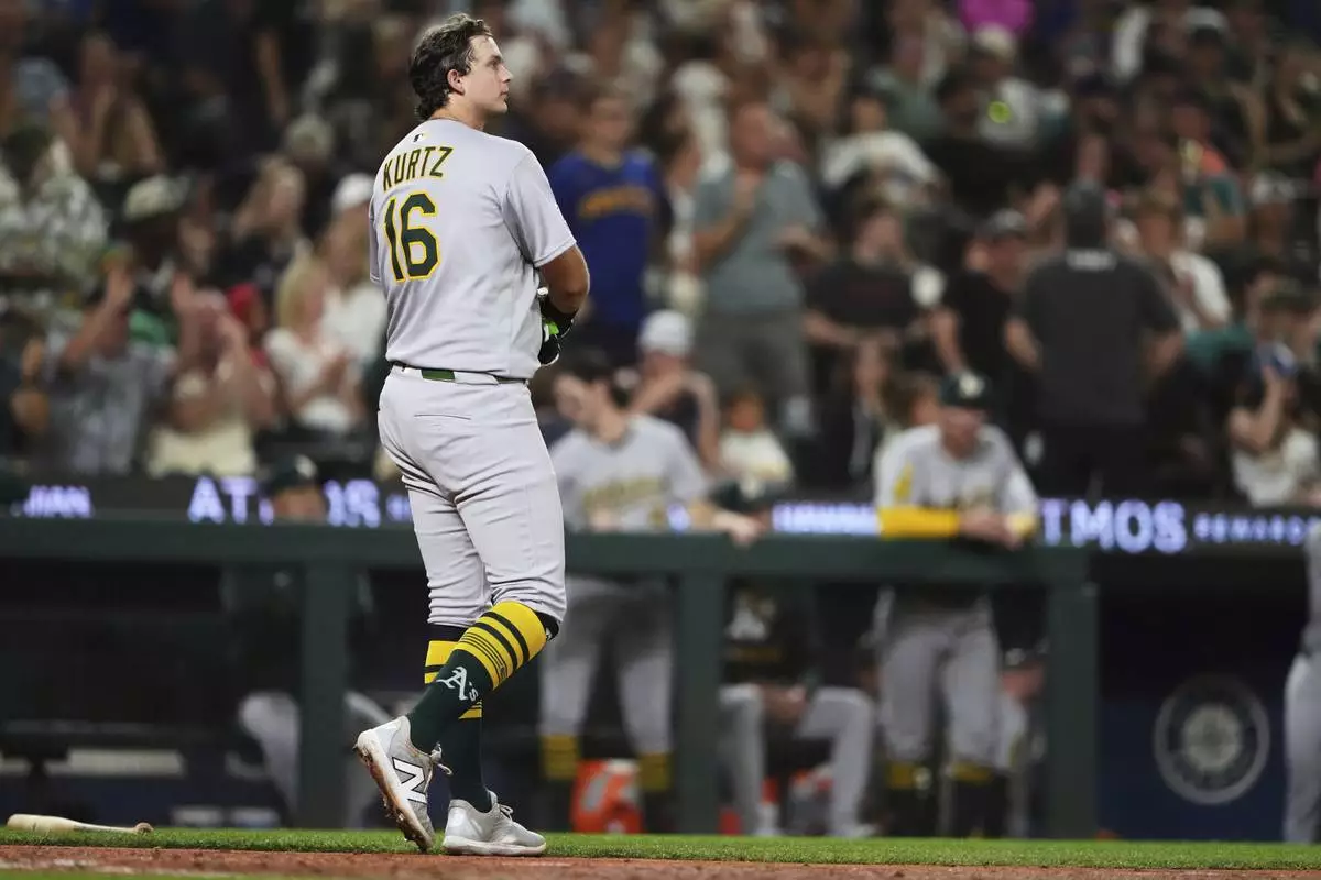 Athletics' Nick Kurtz (16) reacts to striking out to end the top of the eighth inning of a baseball game against the Seattle Mariners, Friday, Aug. 22, 2025, in Seattle. (AP Photo/Lindsey Wasson)
