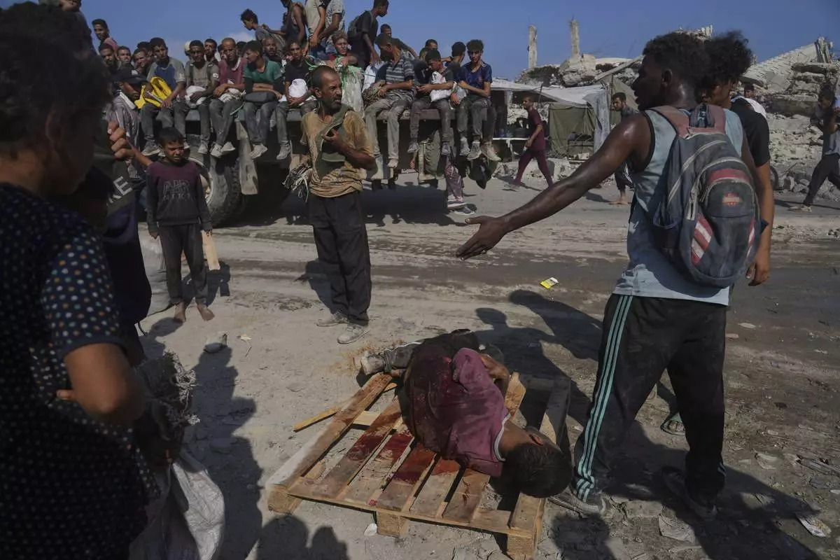 Palestinian relatives mourn over the body of 13-year-old Karim Qdeih, who was killed along with others in overnight Israeli strikes, during his funeral outside Nasser Hospital in Khan Younis, southern Gaza Strip, Saturday, Aug. 23, 2025. (AP Photo/Mariam Dagga)