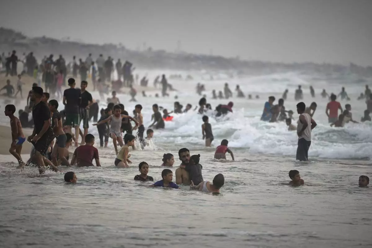 Palestinians cool off in the Mediterranean on a hot summer day near a tent camp by the seaside in Zawaida, central Gaza Strip, Friday, Aug. 22, 2025.(AP Photo/Abdel Kareem Hana)