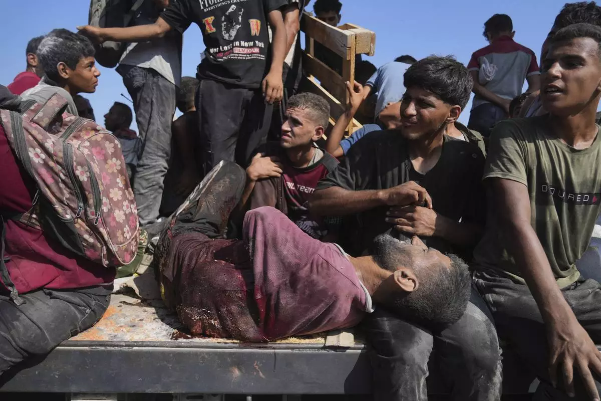 Palestinians, including an injured man, ride on an aid truck returning to Gaza City from the northern Gaza Strip, Saturday, Aug. 23, 2025. (AP Photo/Abdel Kareem Hana)