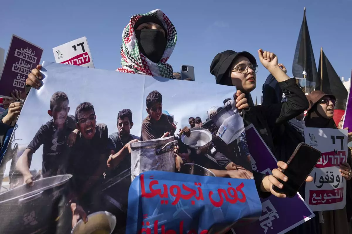 Israeli and Palestinian activists take part in a protest calling for the end of the war and an end to starvation in the Gaza Strip, as they gather in Tel Aviv, Israel, Saturday, Aug. 23, 2025. (AP Photo/Maya Levin)