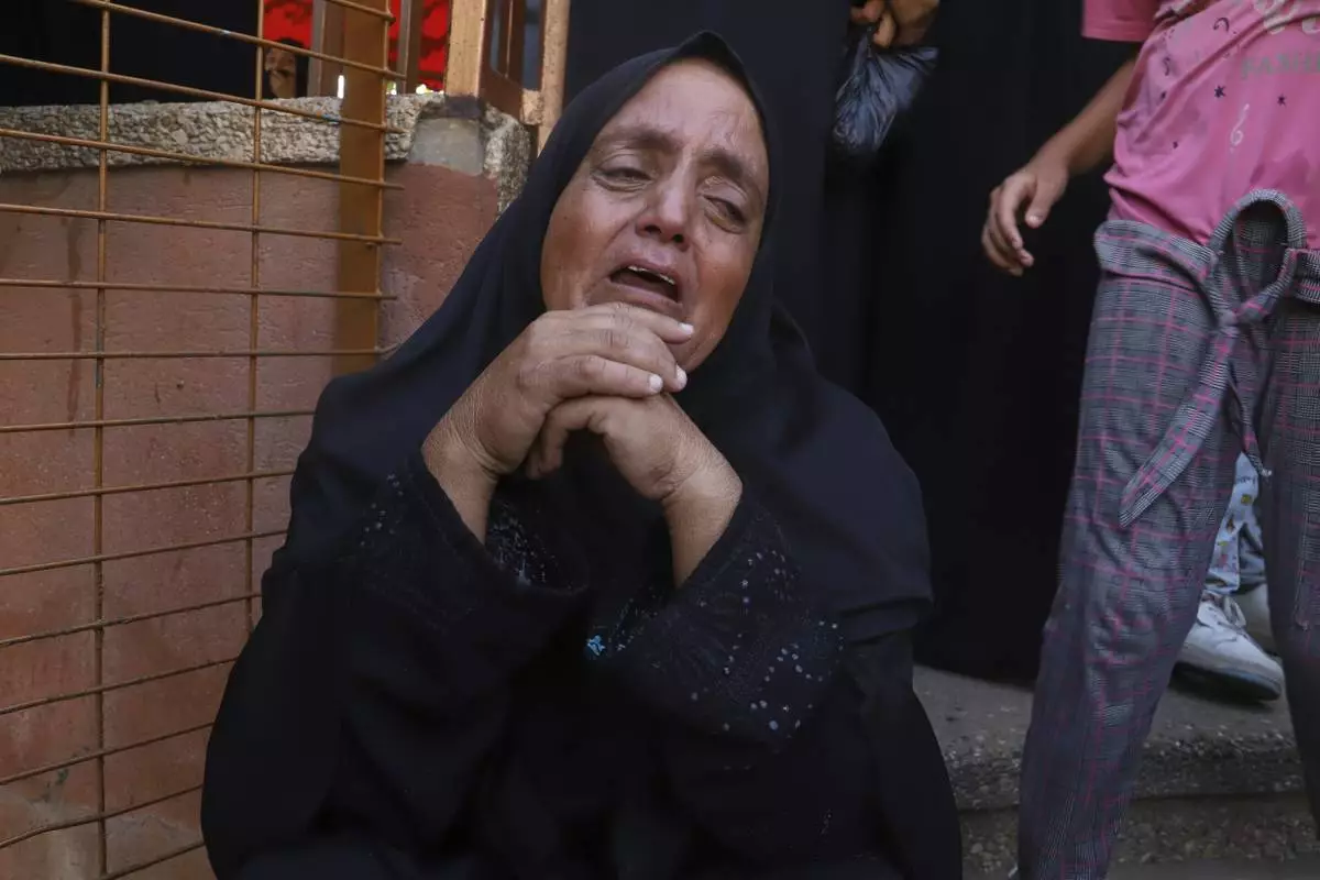 A Palestinian woman mourns her relative, who was killed along with others in Israeli strikes, during their funeral outside Nasser Hospital in Khan Younis, southern Gaza Strip, Saturday, Aug. 23, 2025. (AP Photo/Mariam Dagga)