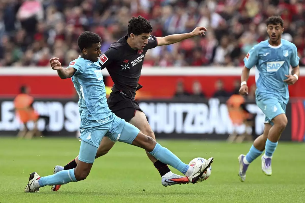 Leverkusen's Ibrahim Maza and Hoffenheim's Bernardo, left, fight for the ball during the German Bundesliga soccer match between Bayer Leverkusen and Hoffenheim at the BayArena in Leverkusen, Germany, Saturday Aug. 23, 2025. (Federico Gambarini/dpa via AP)