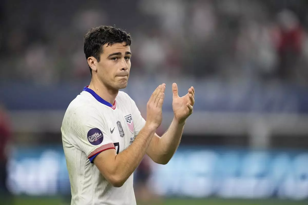 FILE - United States' Gio Reyna walks to the stage during the trophy presentation after a CONCACAF Nations League final soccer match against Mexico, Sunday, March 24, 2024, in Arlington, Texas. (AP Photo/Tony Gutierrez, File)
