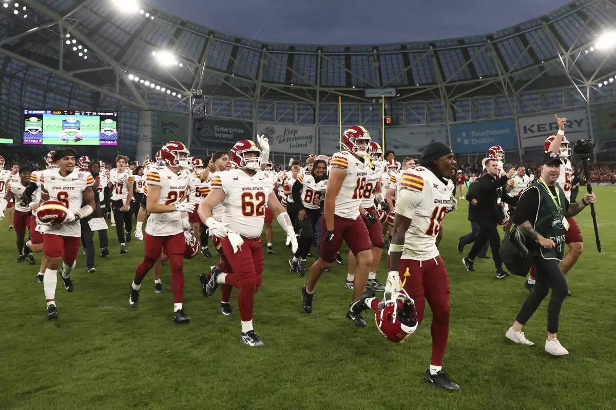 Iowa State players celebrate after winning an NCAA college football game between Iowa State and Kansas State in Dublin, Ireland Saturday, Aug. 23, 2025. (AP Photo/Peter Morrison)